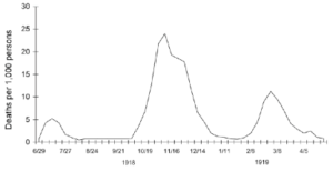 Our current “Chinese flu”, since they still call the older flu “Spanish” although no one knows its actual origins (and India had 17 million of the estimated 50 million who died) has similarities with the Spanish flu. You would recognize this graph as it is just like the one that was drawn out in February as to how our might look, only this graph was hand-drawn after the flu had run its course in 1919.